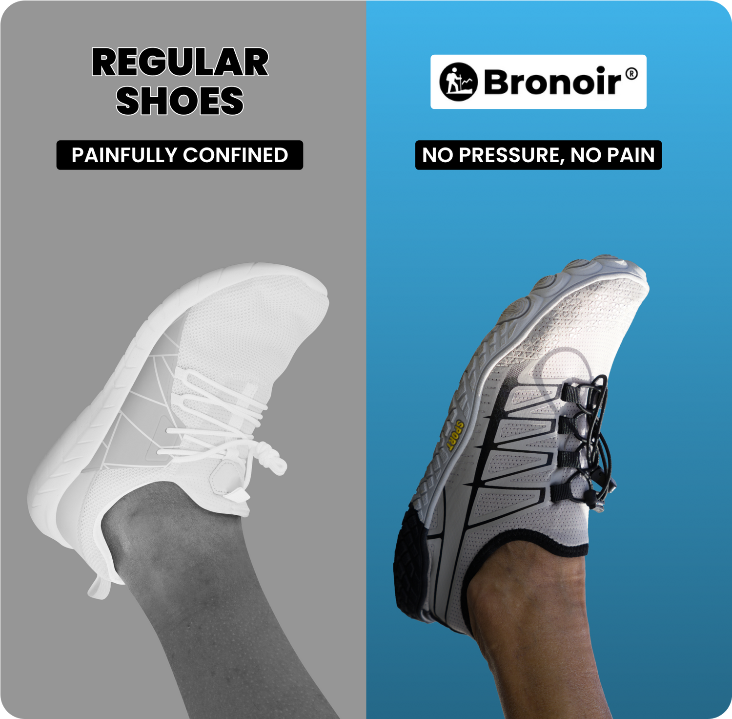 Bronoir™ shoes feature a zero-drop barefoot sole that allows your feet to move as naturally as possible. While they don’t use the rigid arch supports found in conventional shoes, the sole is designed to offer gentle arch comfort and stability, giving you support where you need it while still allowing your feet to strengthen and function naturally over time.