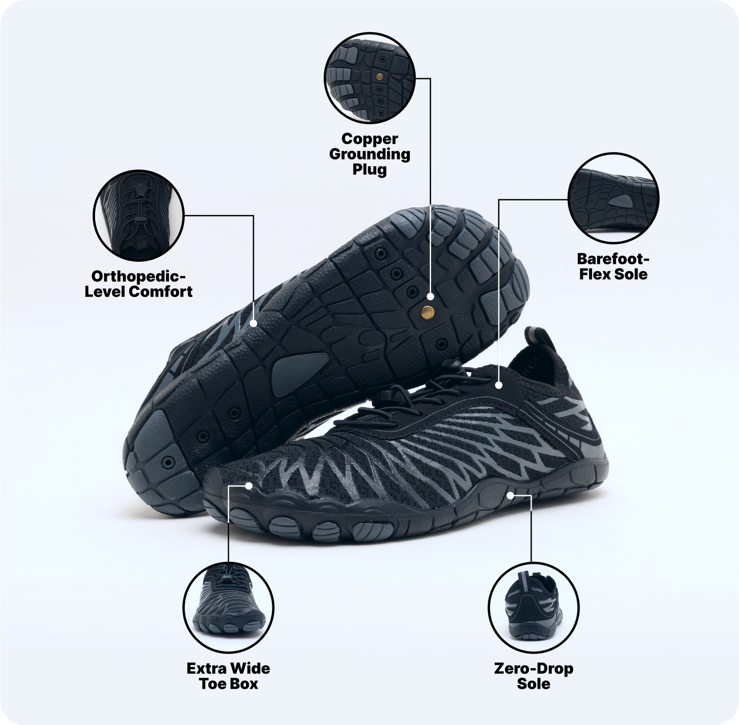 The grounding feature is made possible through a built-in copper plug integrated into the sole. Copper is highly conductive and connects your body to the Earth’s natural energy when in direct contact with the ground.