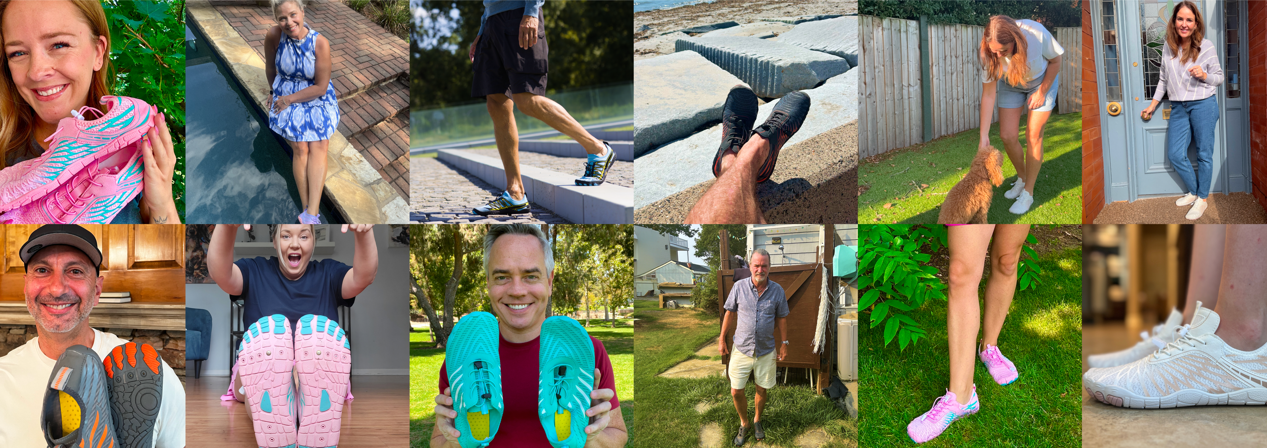 The upper materials vary depending on the model (breathable mesh, durable leather, or waterproof synthetics).